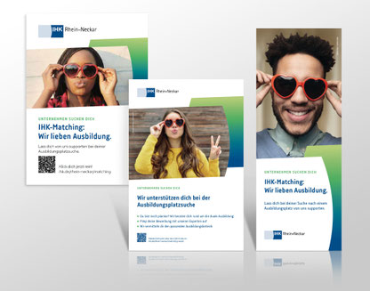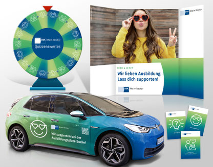 In einer breit angelegten Kampagne macht die IHK Rhein-Neckar auf sympathische Art Jugendliche auf ihren Support bei der Suche nach einem Ausbildungsplatz aufmerksam. Von Anzeigen, über Beklebung von Geschäftswagen bis hin zur Präsenz bei Messen – mit einem Glücksrad-Quiz rund um das Thema Ausbildung – sollen die Jugendlichen dazu animiert das Angebot der IHK Rhein-Neckar zu nutzen, um den richtigen Beruf für sich zu entdecken und den passenden Ausbildungsbetrieb zu finden.